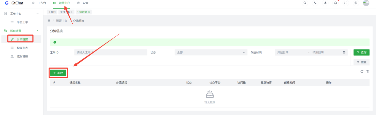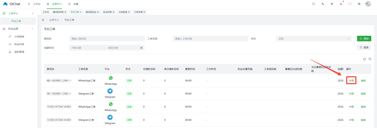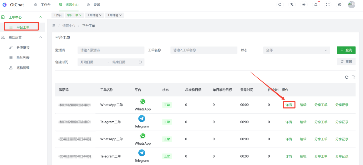 工单主要用于您的进粉及客服工作量统计及管理工单是激活码创建后自动生成,在管理后台 「 平台工单 」 可进行管理 ;