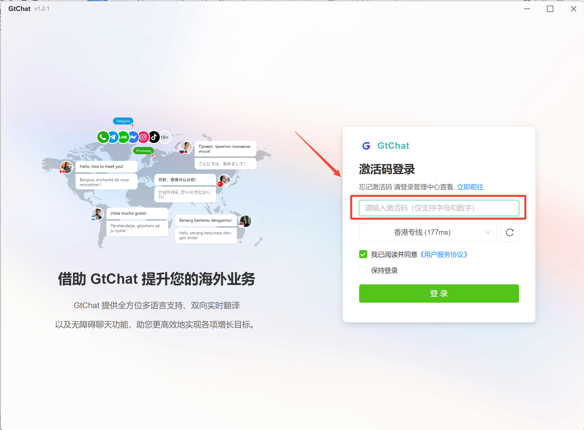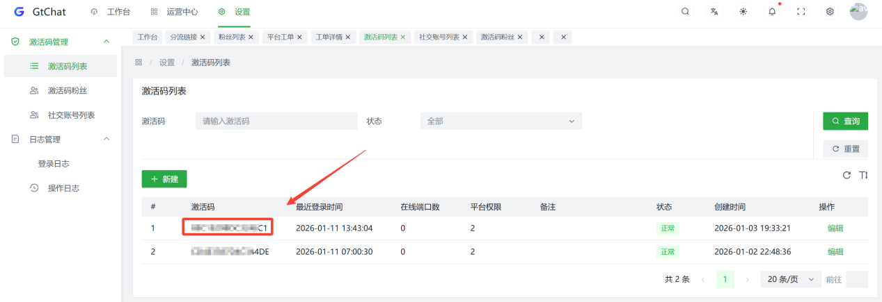 您可以在主管后台中找到"设置"→"激活码列表"页面 。然后找到"新建激活码"按钮,新建完成后返回列表, 复制刚刚创建的激活码交给客服去GtChat客户端完成登录。