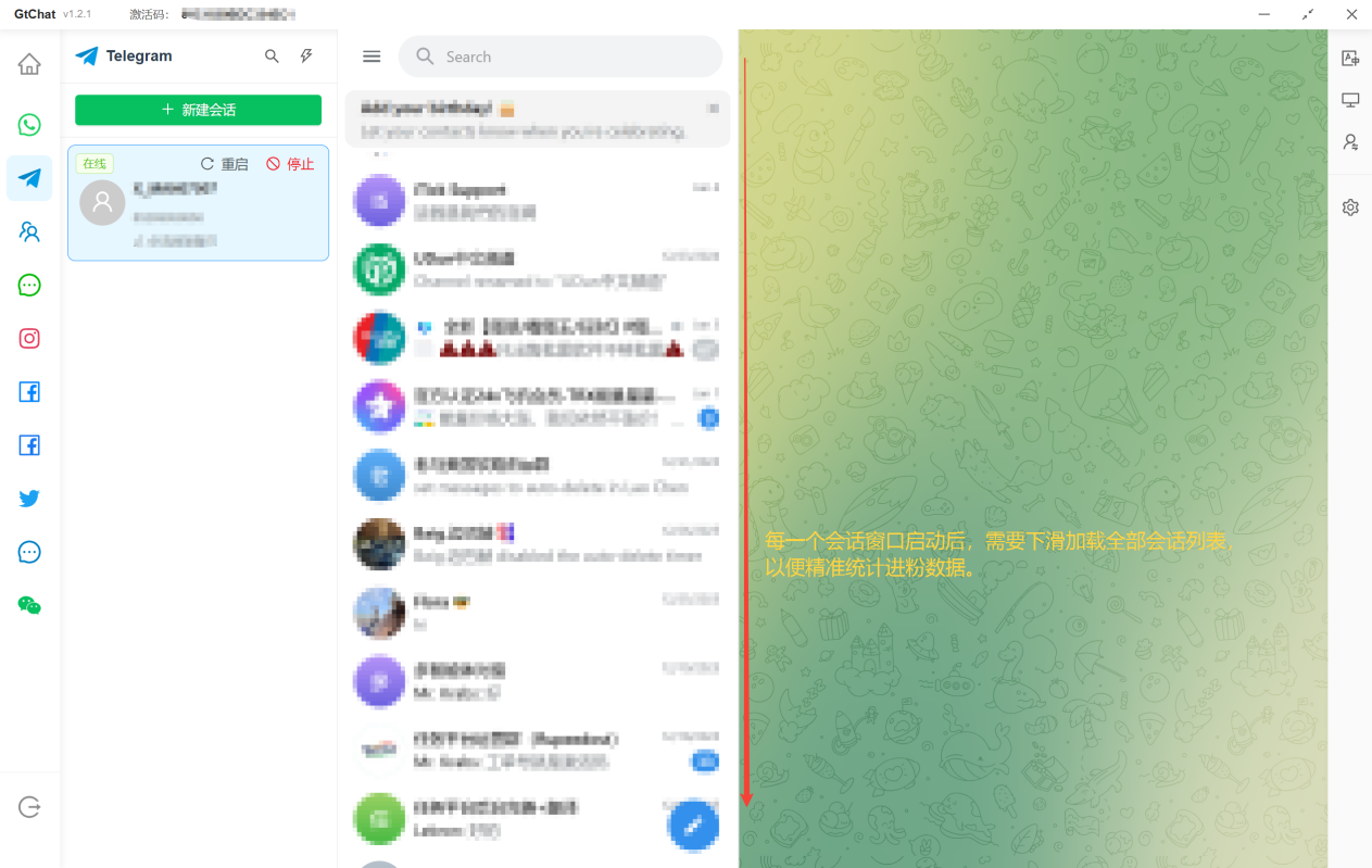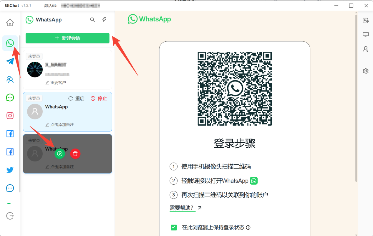 选择想创建工单的平台,点击【新建会话】点击启动按钮,扫码登录社交账号;