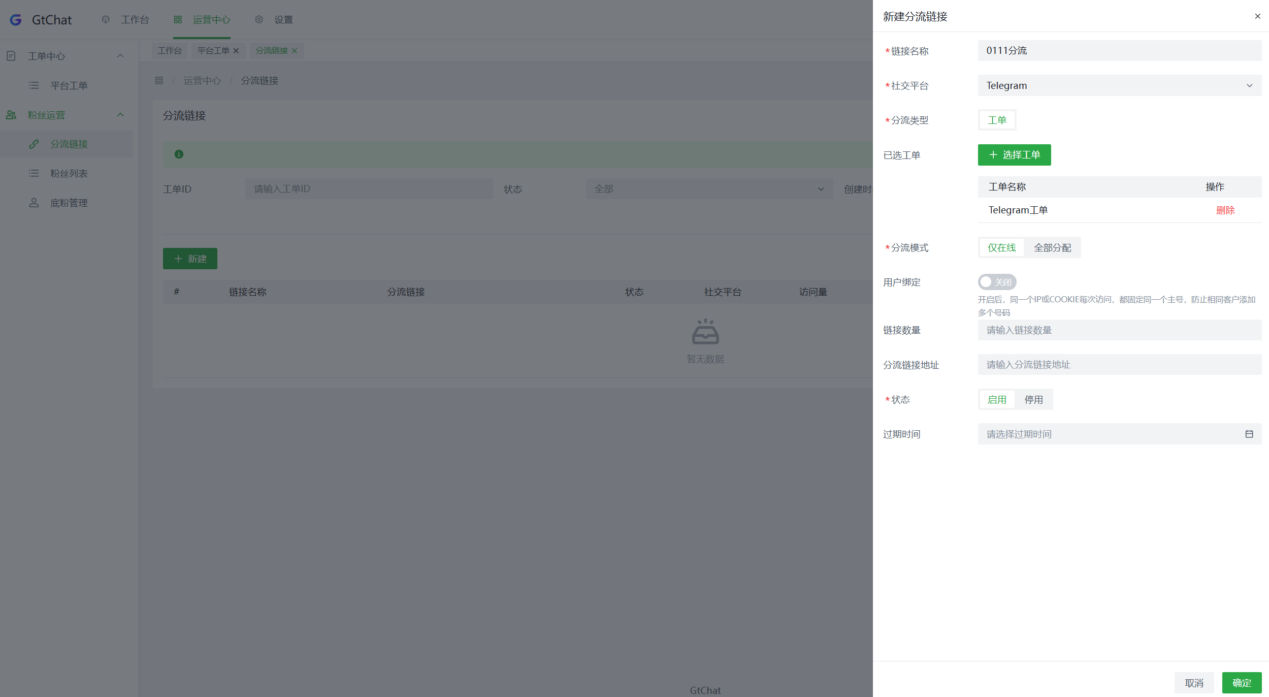 点击创建分流链接 , 完成相关设置,目前 WhatsApp、Telegram等平台支持创建使用分流链接,使用分流链接给账号营销使用,实时查看点击状况,进一步实现营销转化;