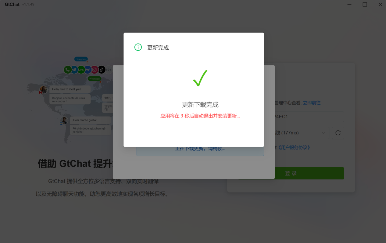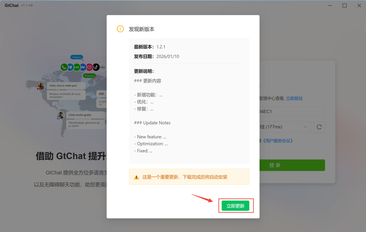 在软件使用过程中,如出现以下更新提示,请点击立即更新,等待下载完成,按照下图点击下一步,点击完成,重新登录软件即可继续使用。