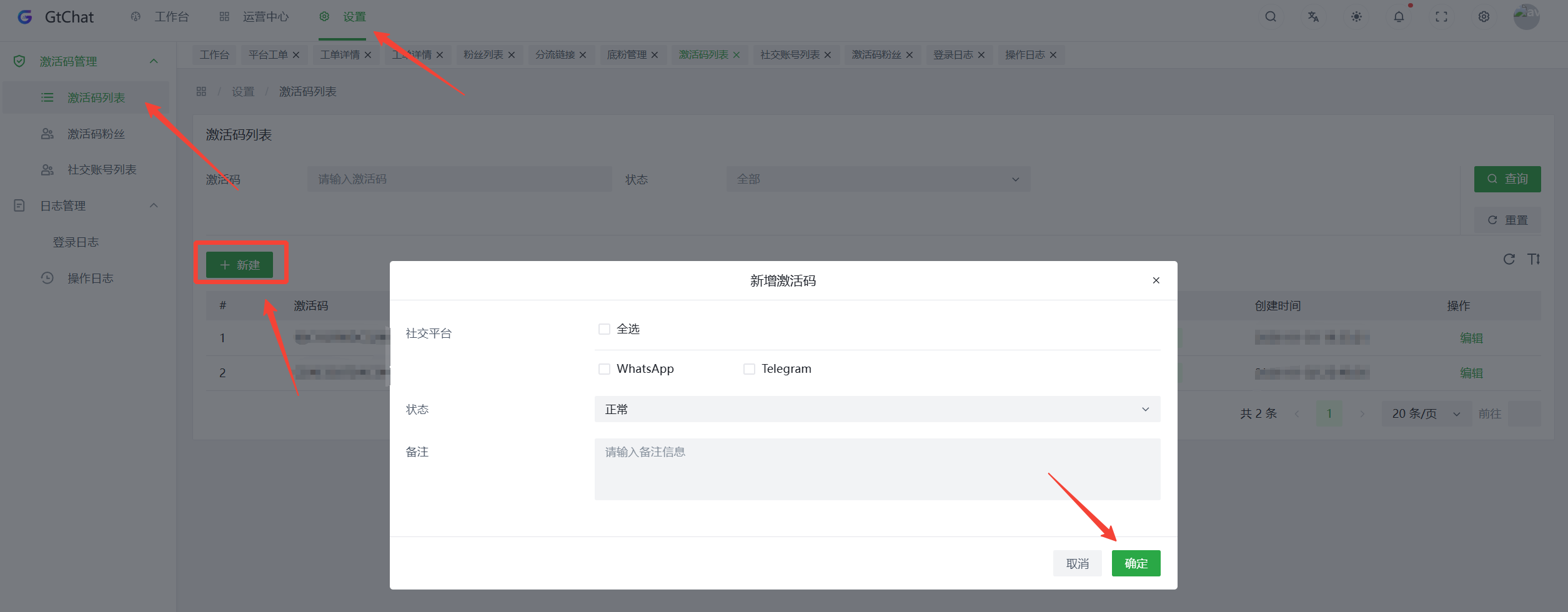 点击【 激活码管理 】→【 激活码列表 】→【新建 】 按照需求设置内容 →【 确定 】