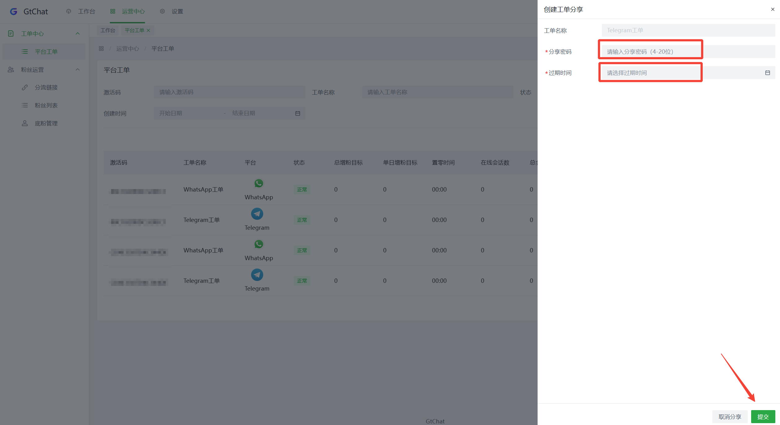 在平台工单点击【分享工单】设置密码和过期时间。点击【确定】