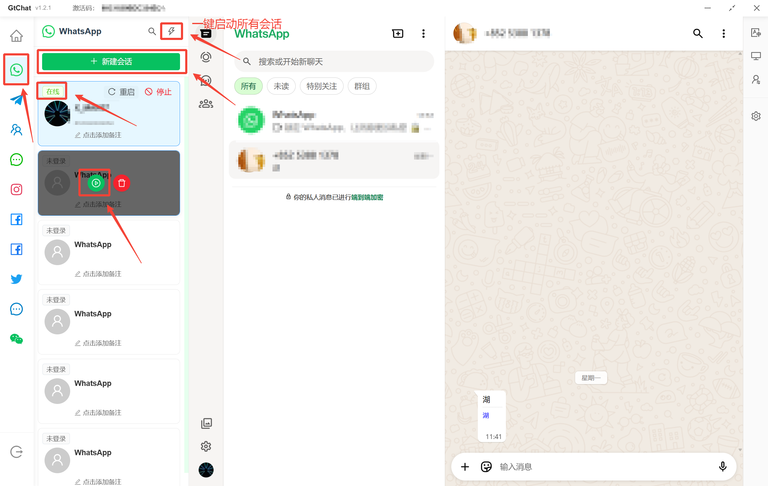 WhatsApp 平台为例,选中左侧 WhatsApp 图标,进入平台 → 点击【 新建会话 】→【 打开会话 】打开手机 WhatsApp 扫码登录即可,进入账号聊天界面,会话卡片左上角显示在线,说明登录成功