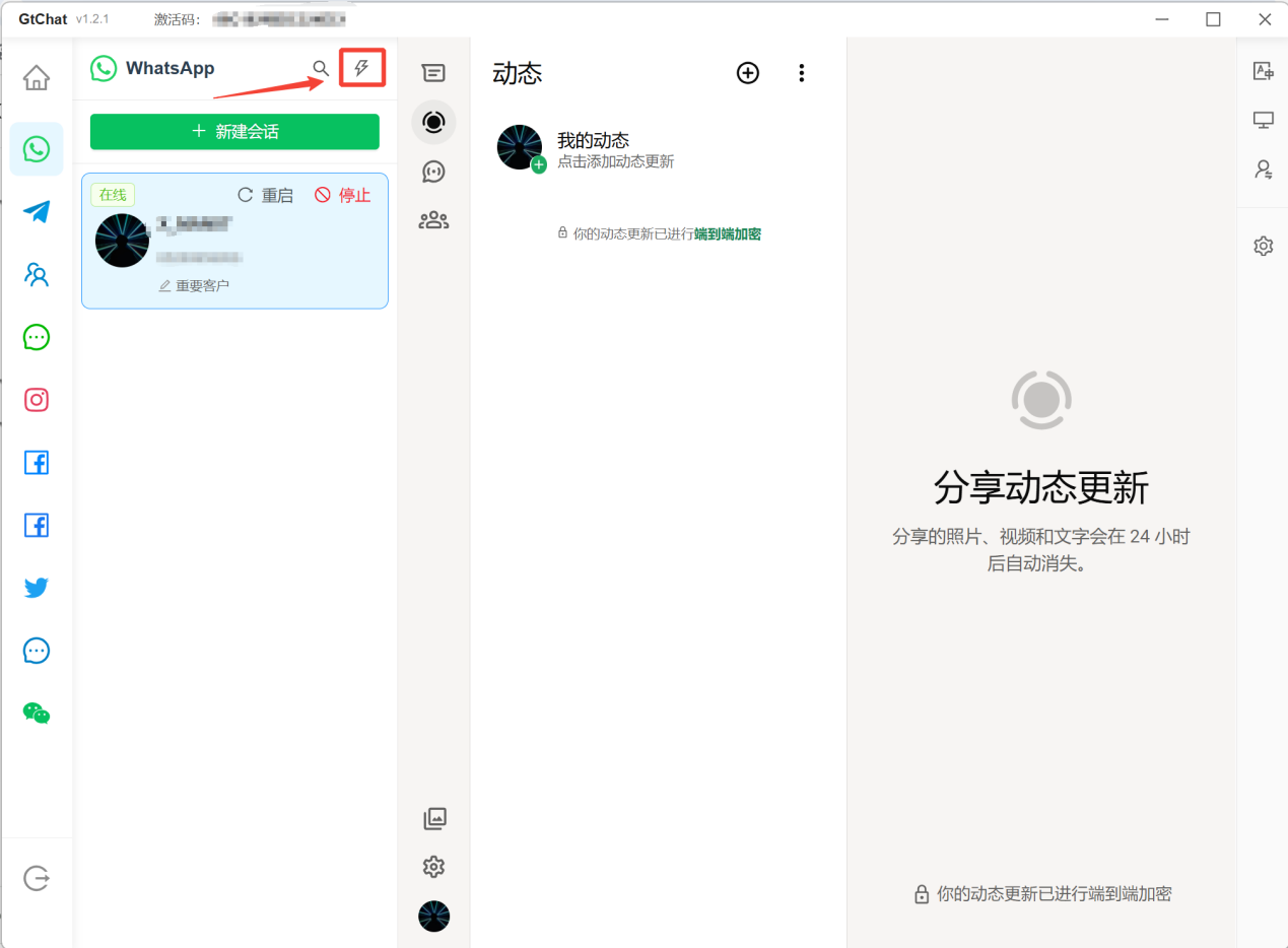 登录成功后请点击绿色启动按钮,即可开启聊天。如有多个会话需要同时启动请点击下图,批量开启会话按钮。