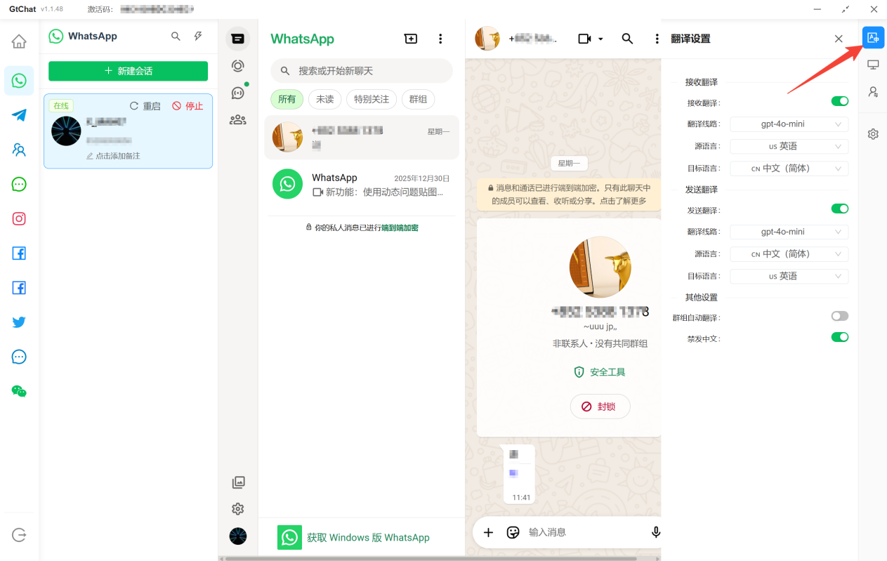 选择一个账号会话,在右侧栏找到 【 翻译设置 】,在这里可以为每个平台设置全局翻译线路(默认选择gpt-4o-mini),根据客户语言,客服销售人员可打开独立翻译开关,单独对客户设置语言。