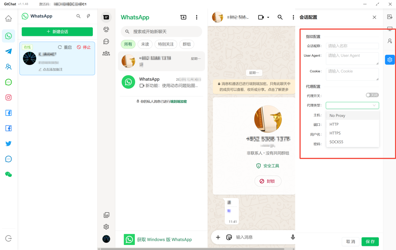 您需要先关闭会话再添加代理信息,当前代理支持HTTP/HTTPS/SOCKS4/SOCKS5;